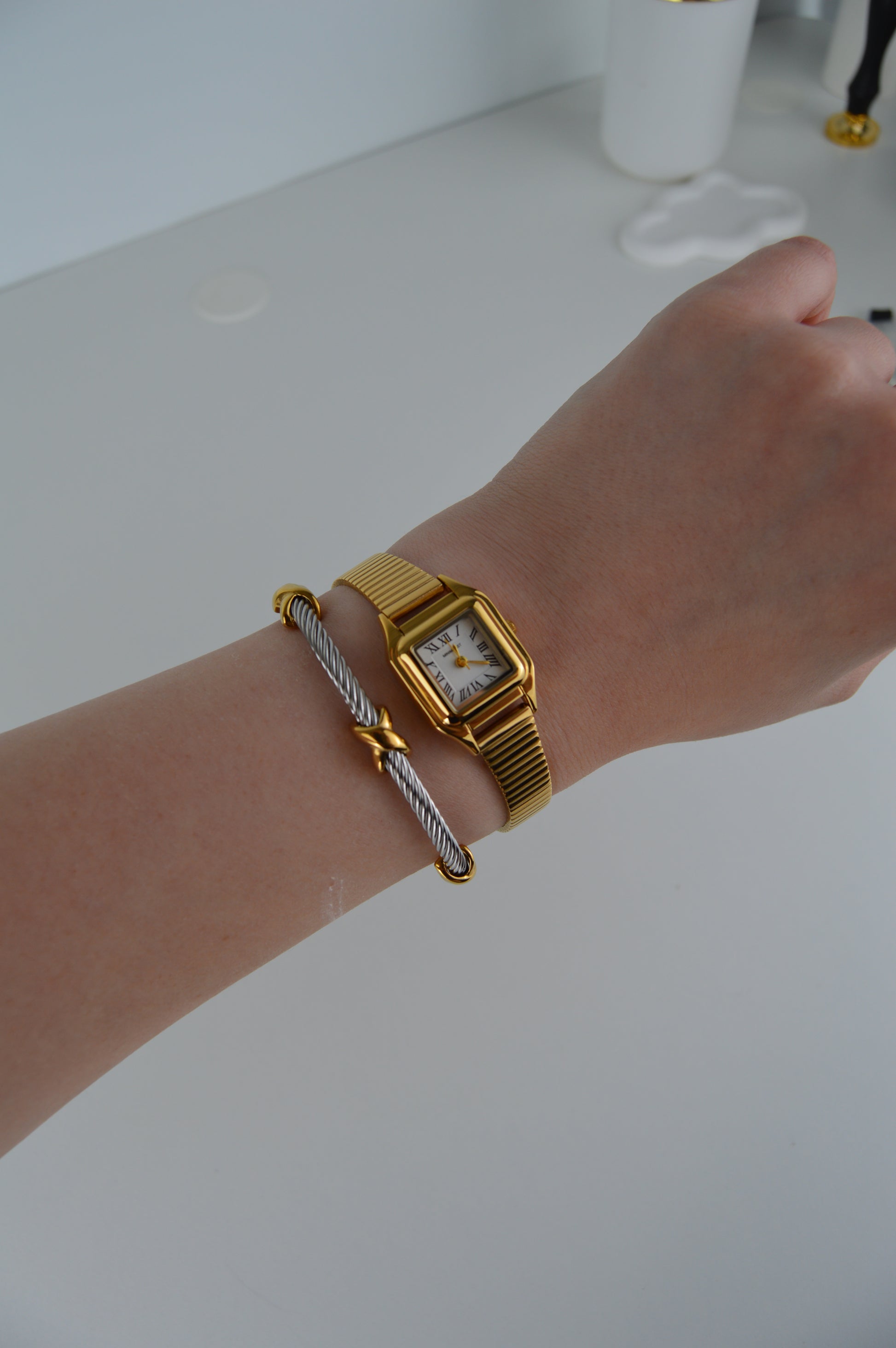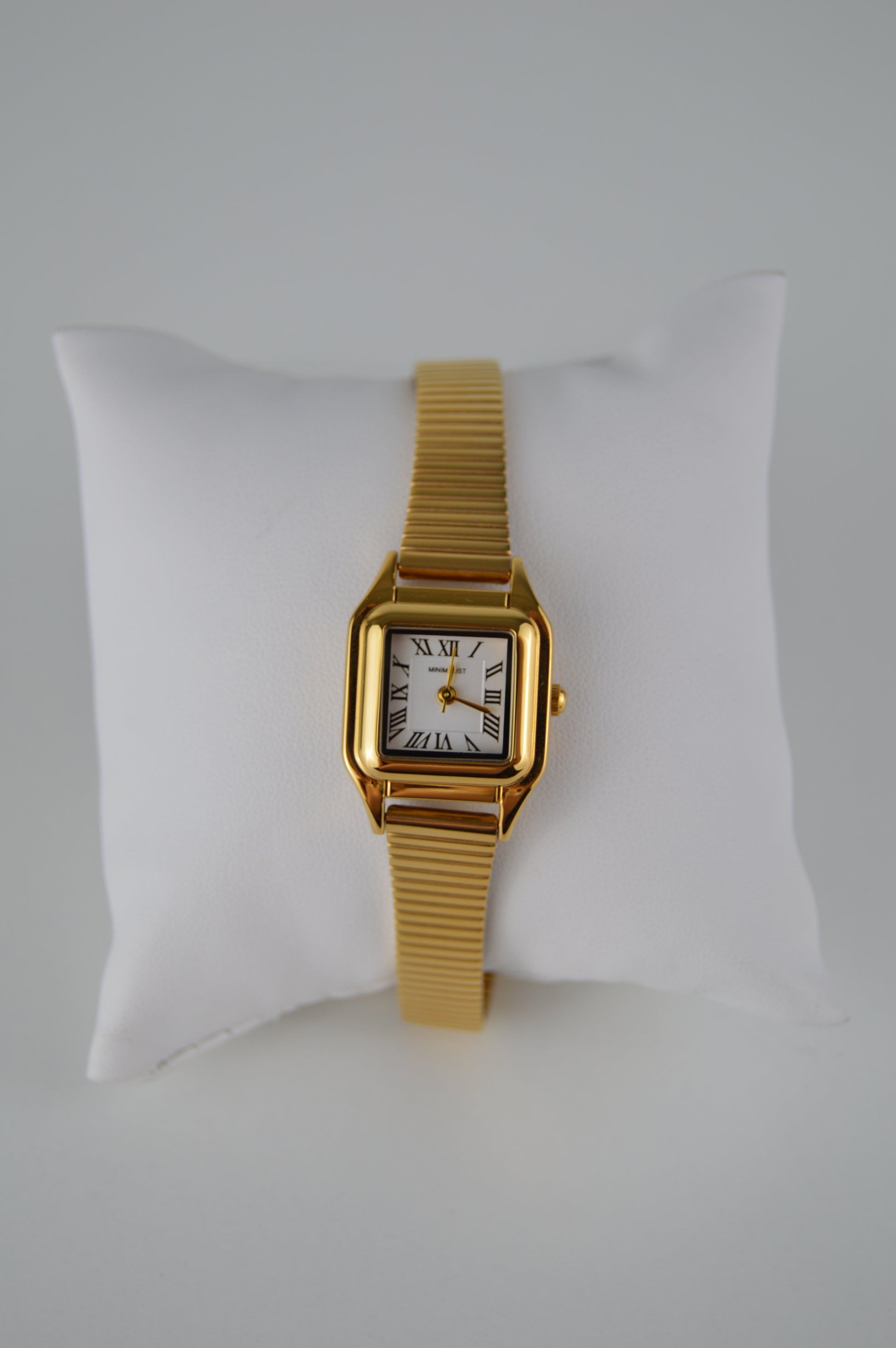 تصميم مستوحى من الأناقة الكلاسيكية بلمسة عصرية بسيطة. ساعة مربعة بوجه أبيض مزين بأرقام رومانية، وسوار أنيق مطلي بالذهب